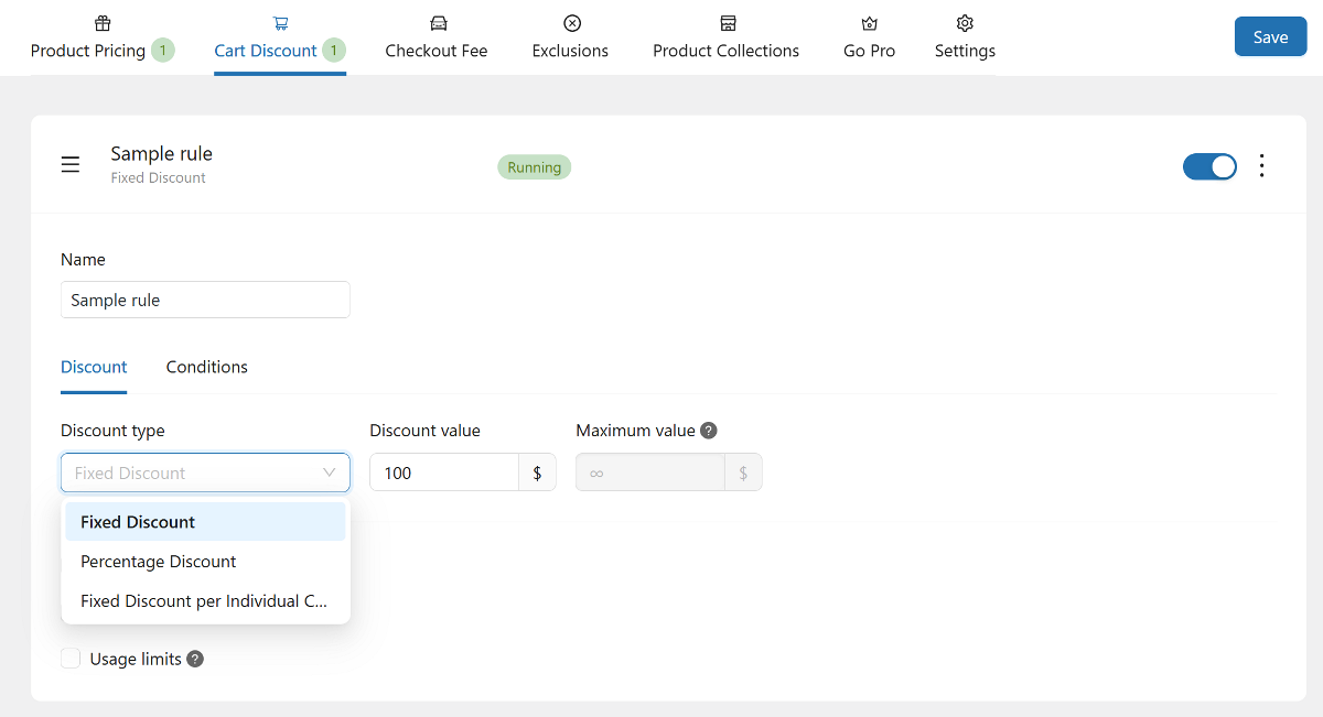 YayPricing offers more cart-level options. You can set up free shipping discounts based on conditions, add checkout fees, and apply fixed discounts per item. These give you flexibility at the checkout stage that Elevated doesn’t match.