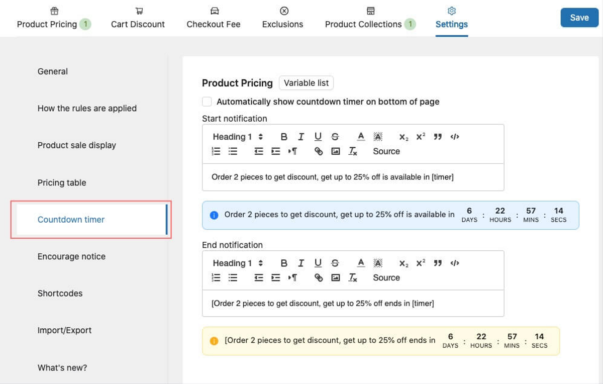 YayPricing includes countdown timers to create urgency and shortcodes for displaying discounts anywhere.