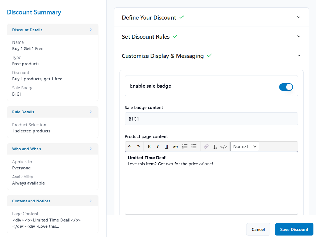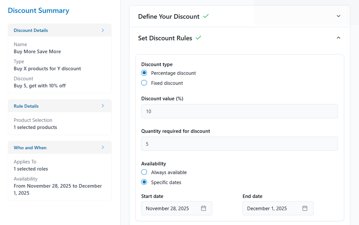 Elevated Discount Rules uses a two-column layout where you see your progress on one side while configuring settings on the other. This single-screen approach lets you build and verify complex rules without clicking between tabs.